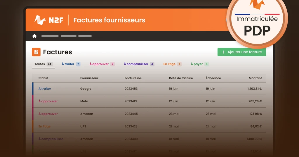 Le terme officiel a évolué : les « PDP » (Plateformes de Dématérialisation Partenaires) sont devenues les « PA » (Plateformes Agréées) suite à l'ordonnance de 2024. C'est le même concept : un opérateur immatriculé par la DGFiP pour transmettre vos factures électroniques. N2F est une PA immatriculée depuis juillet 2025.